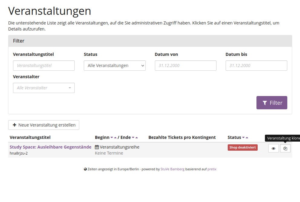 - nach Möglichkeit existierende Veranstaltungen klonen